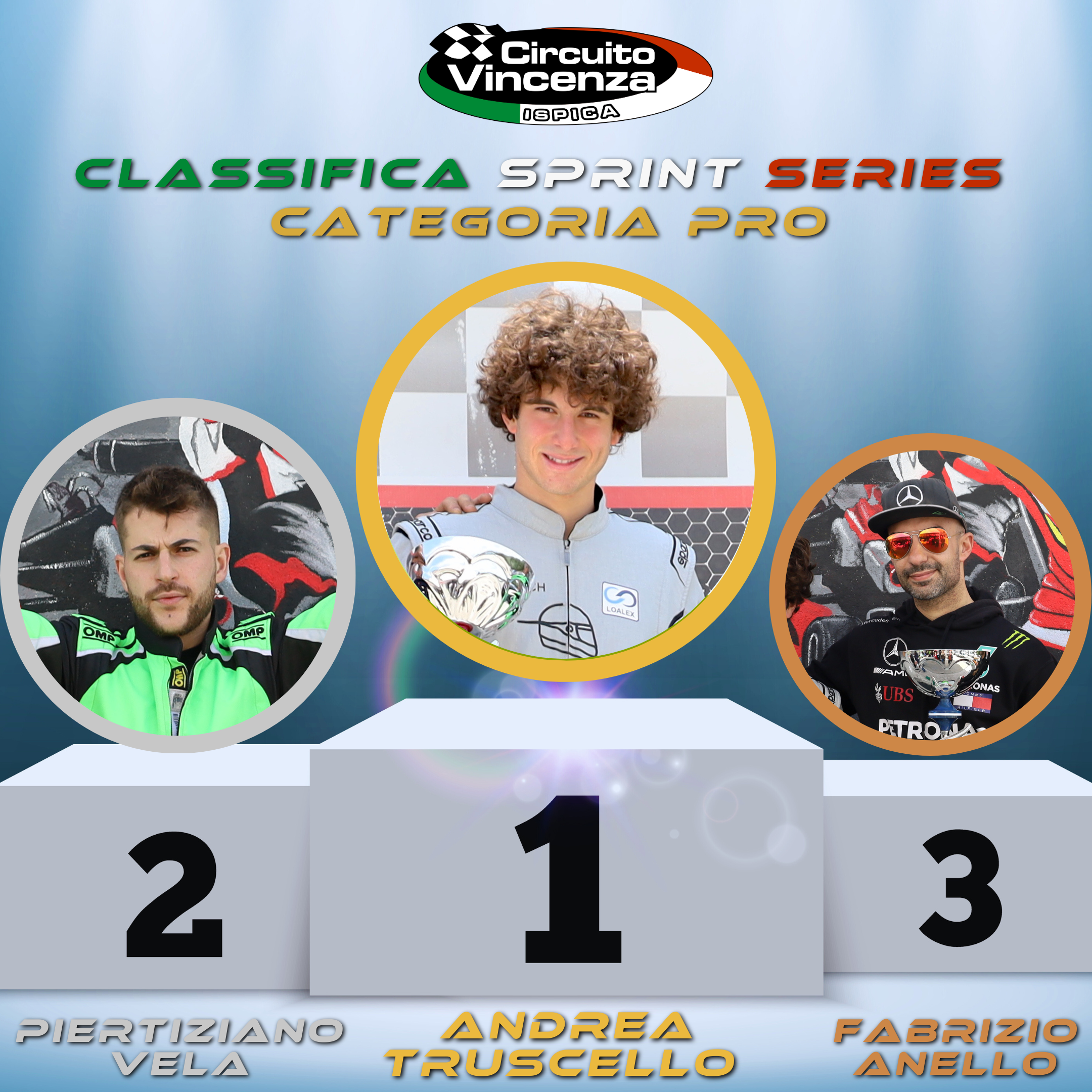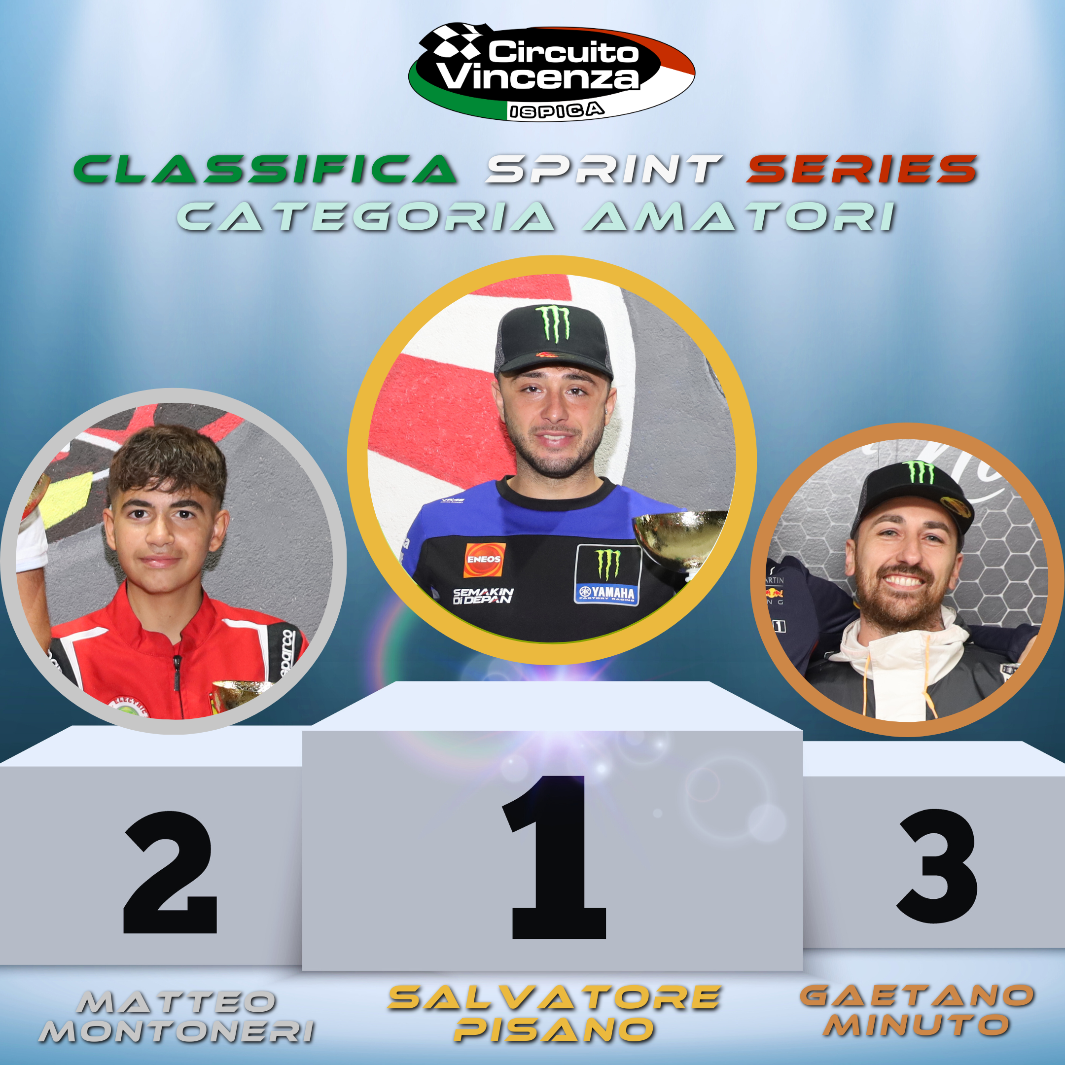 Inanellando una lunga serie di vittorie Pisano si è aggiudicato il campionato sprint di categoria. Alle sue spalle si è piazzato Matteo Montoneri giovanissimo e promettente. Matteo ha avuto una splendida stagione in cui è cresciuto tantissimo e ha conquistato meritatamente il secondo gradino del podio riuscendo a difendersi dalle insidie del terzo classificato Gaetano Minuto.